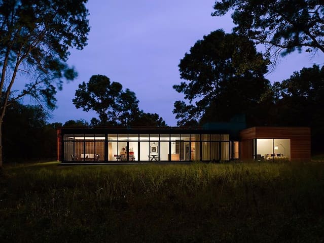 If you and five of your friends are looking to spend your weekend at Indiana Dunes State Park, look no further than this glass house, set against a mellow meadow backdrop, which shares its 35 acres with the occasional horse. Floor-to-ceiling windows offer expansive views and heated concrete floors will ensure toasty toes in cooler months. Three bedrooms and a fully stocked kitchen round out the rental, which only allows kiddos over eight years old (boooo says the parent with an infant). Rates starting at $439/night.